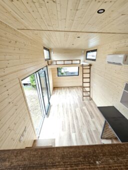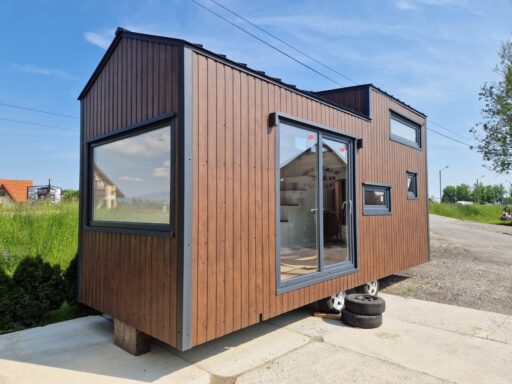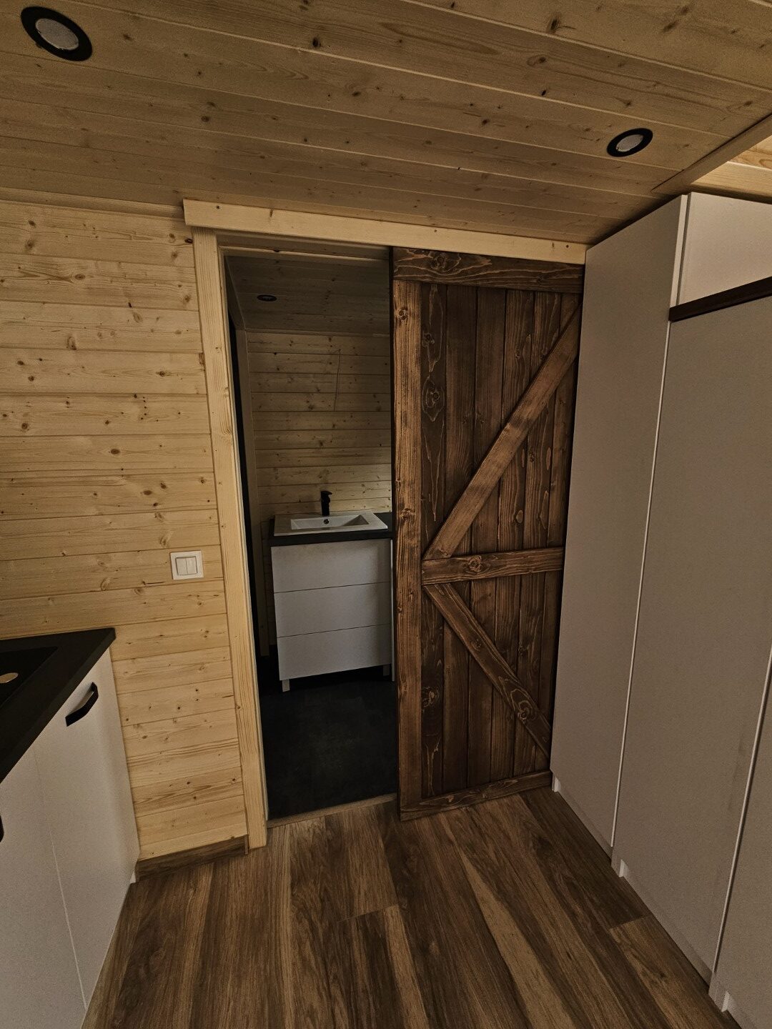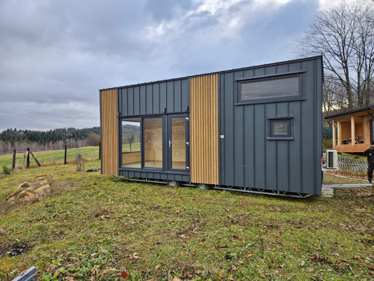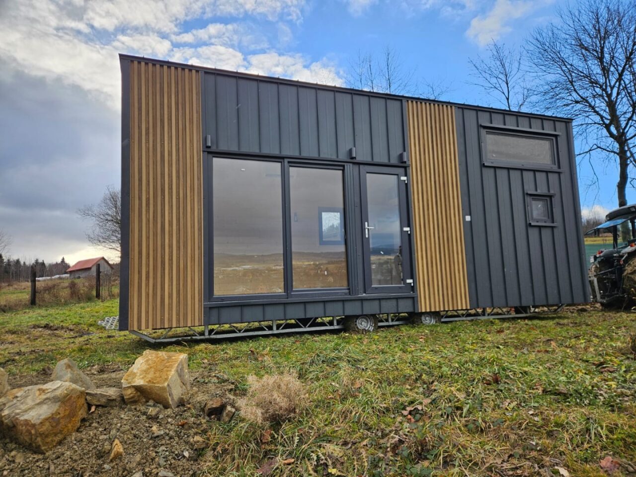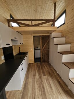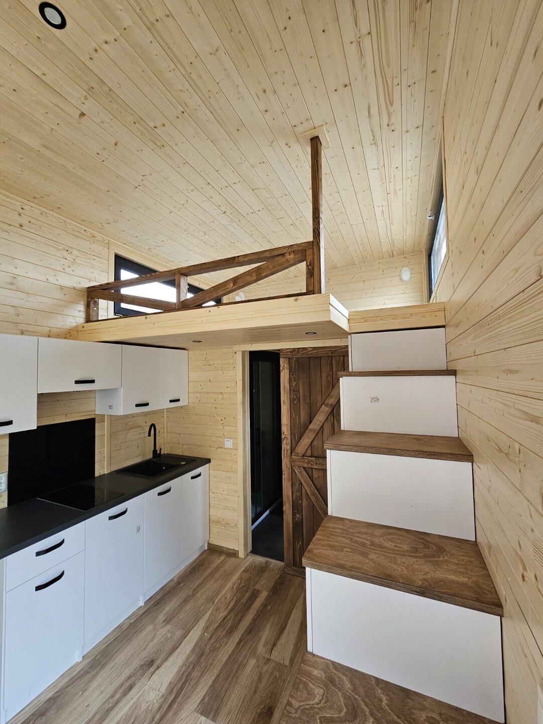 Domek mobilny Miki to nasza nowa propozycja. Zbudowany jest na przyczepie, dzięki czemu możesz poruszać się z nim po drogach lub postawić na działce w otoczeniu przyrody. Posiada dużo przeszkleń, które wpuszczają światło dzienne do wnętrza. Wnętrze jasne, wykończone drewnem w naturalnym kolorze. Szafki w kolorze białym z czarnym blatem w aneksie kuchennym. Domek mobilny Miki jest jednym z naszych największych domków o rozmiarach 300cm x 810cm i posiada aż dwie antresole.