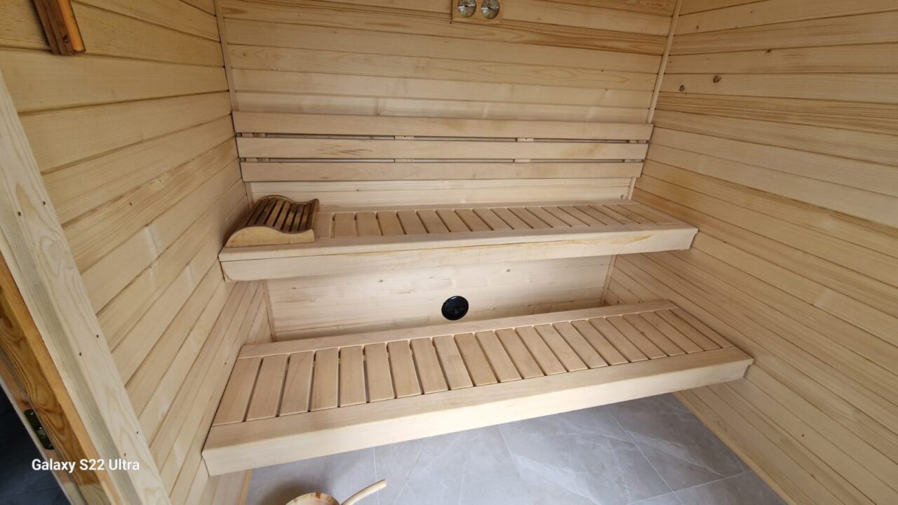 - Wymiary: 3 x 2,2 cm – przestronna sauna z dodatkowym miejscem na przedsionek lub prysznic, dodatkowo pomieszczenie pod jacuzzi 3,5 x 2,2 m