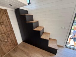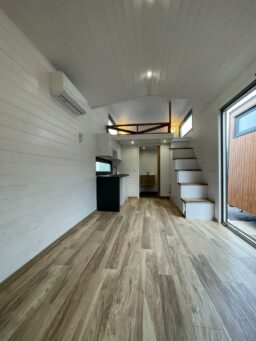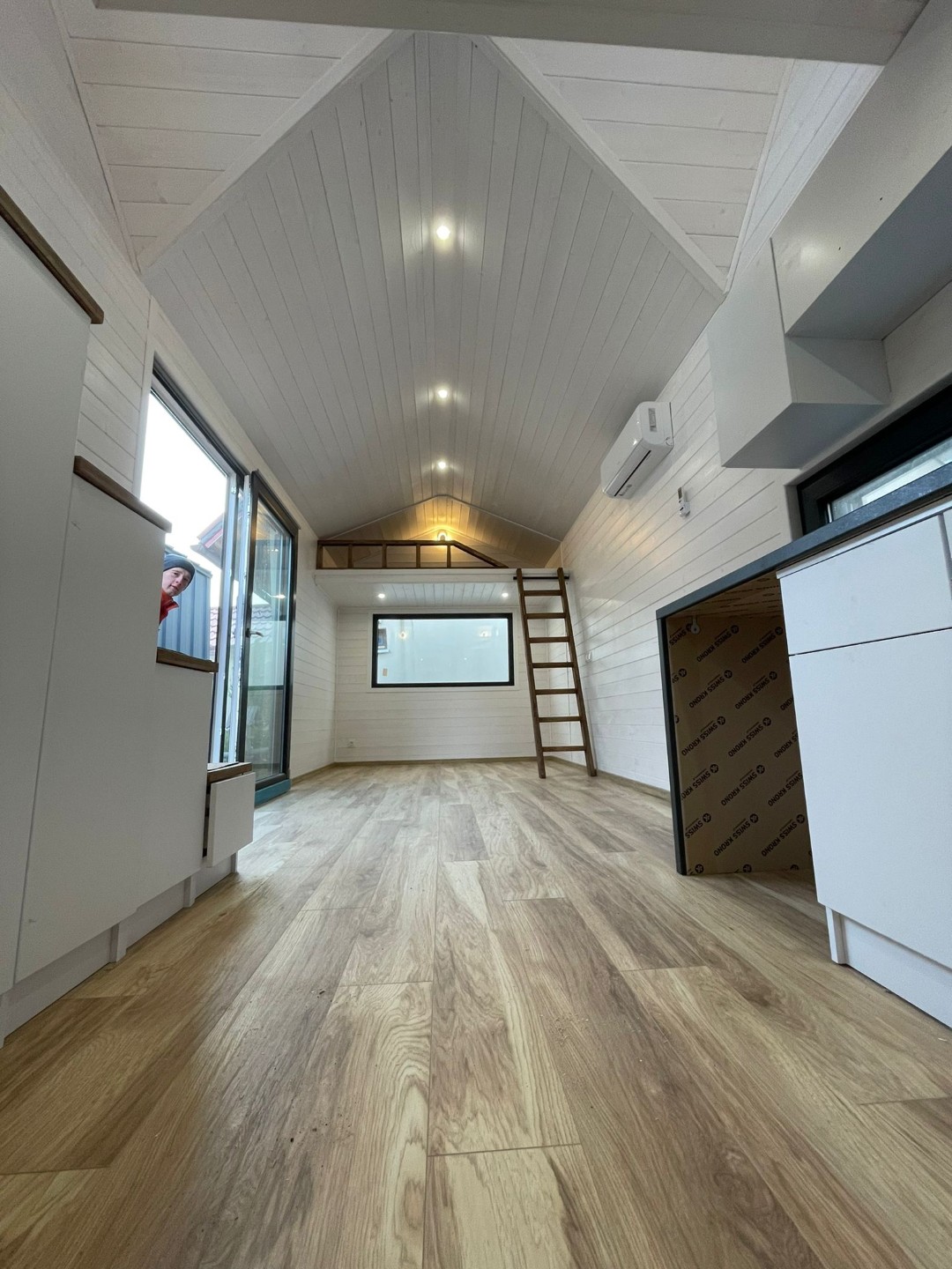 Mobilny domek Tomek o wymiarach 300cm x 800cm stworzyliśmy dla tych, którzy potrzebują znacznie więcej przestrzeni. Dzięki temu znacząco powiększyła się powierzchnia salonu i kuchni. W wersji A możliwe było umieszczenie dwóch praktycznych sypialni na antresolach. Wersja B to model z dodatkową zamykaną sypialnią na parterze.