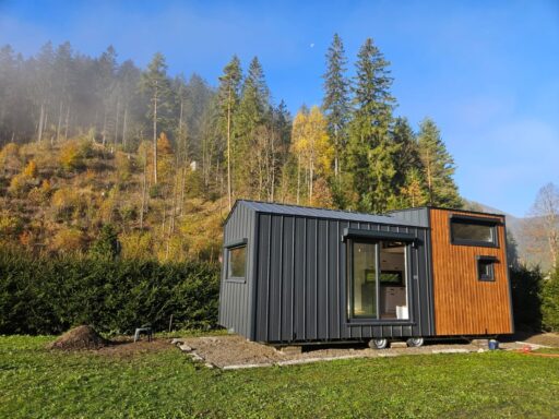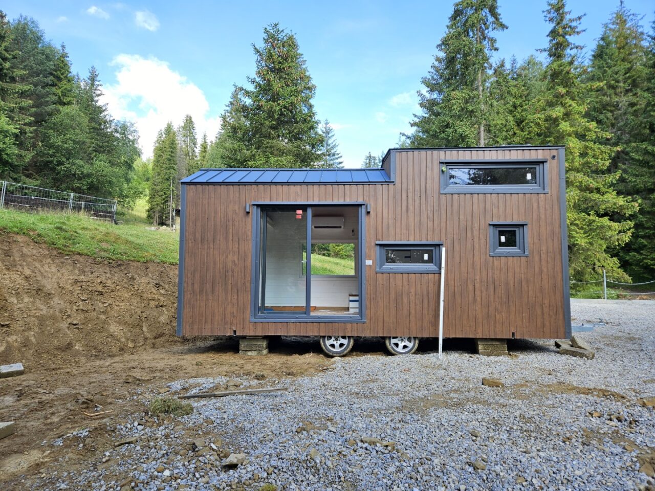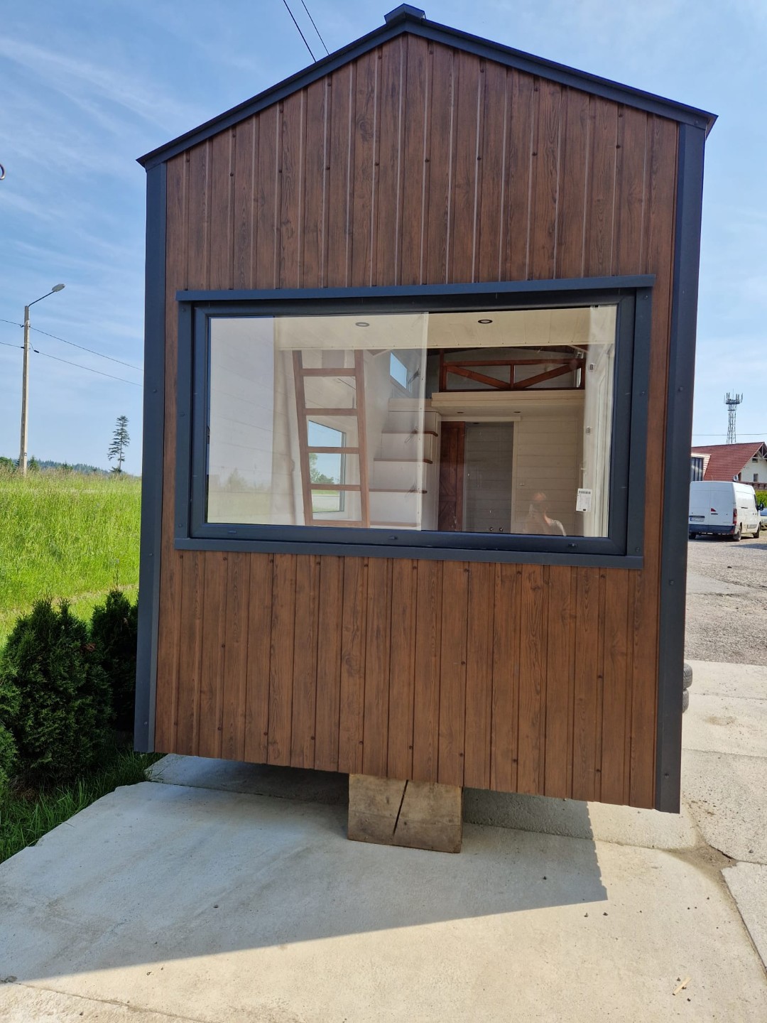Domek zbudowany na przyczepie, nie wymaga pozwolenia na budowę. Domek jest wykonany z bardzo wysokiej jakości drzewa konstrukcyjnego ciętego na maszynie CMC o wilgotności nie przekraczającej 12%. Na domku jest nowoczesna i wysokiej jakości blacha panelowa z nowym systemem na rąbek oraz specjalnymi wytłoczeniami zapobiegającymi falowaniu się blachy.