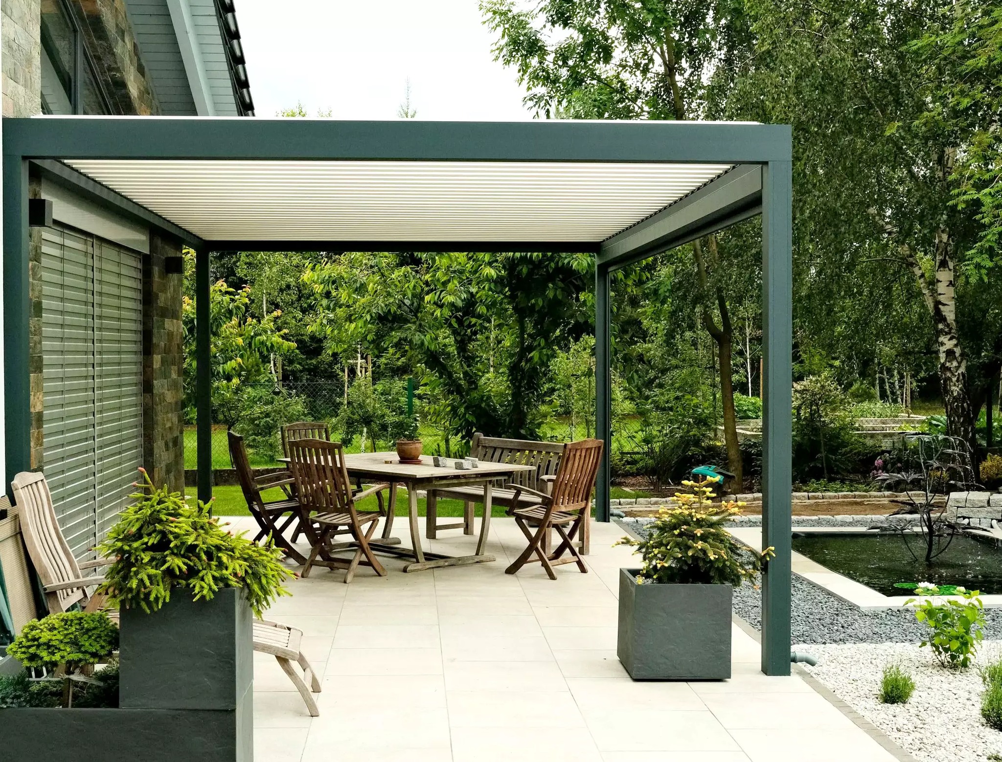 ✔️ Zintegrowany system odprowadzania wody – Pergola wyposażona jest w ukryty system odprowadzania deszczówki, który chroni przed opadami, pozwalając cieszyć się przestrzenią nawet podczas deszczu.